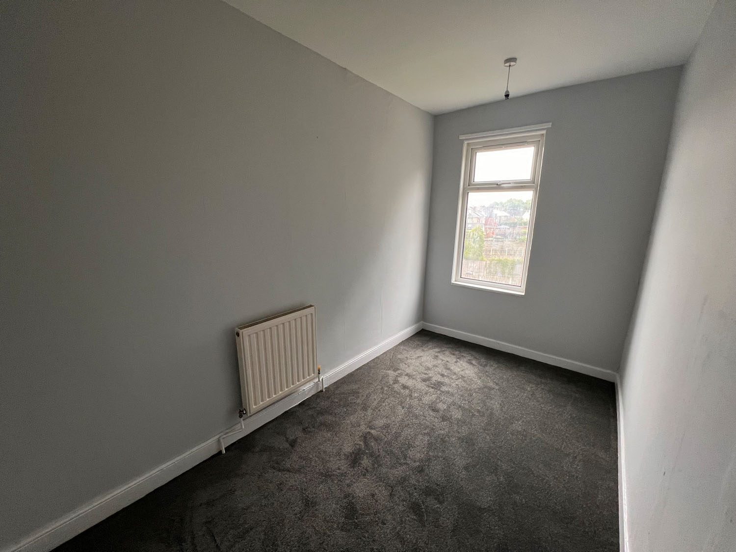 A single bedroom having a rear facing uPVC double glazed window, carpet and a radiator.