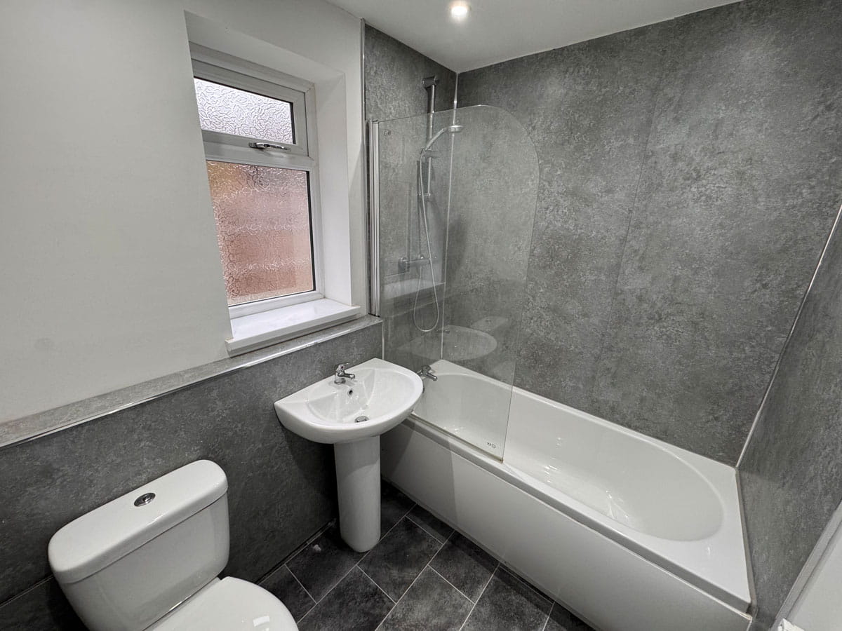 Having a side facing uPVC double glazed window, bath with separate shower head and screen, W/C and a wash hand basin.