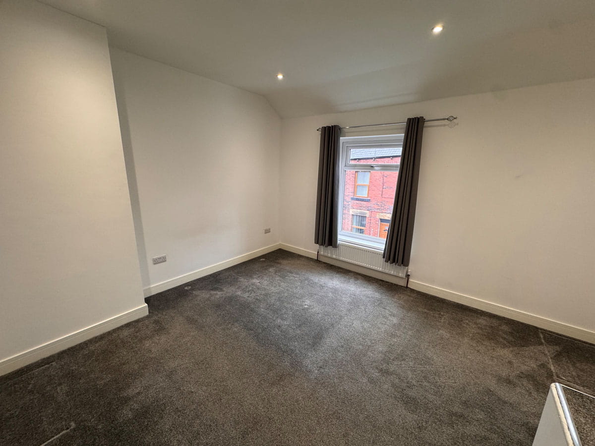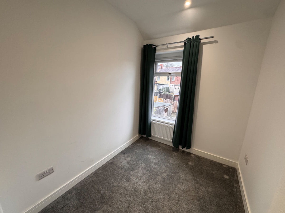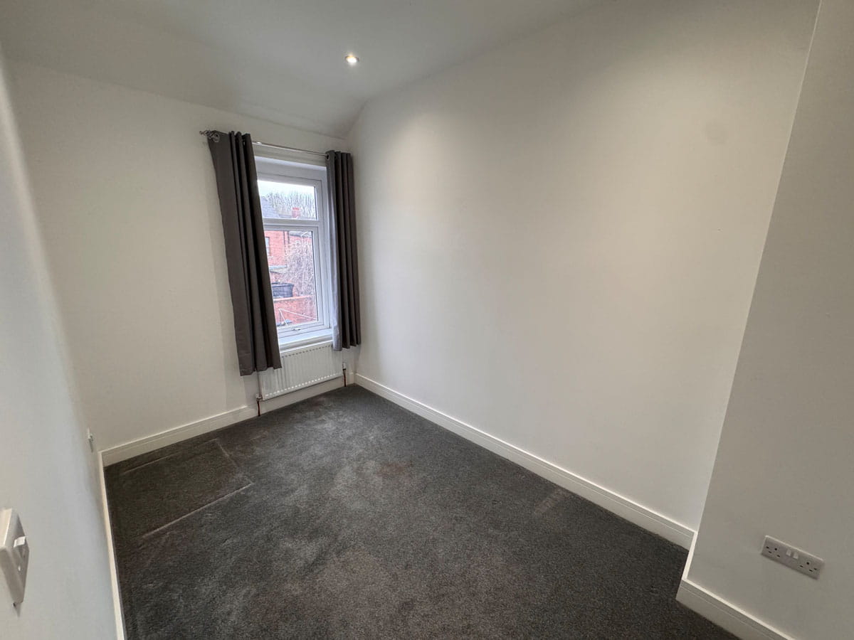 A single bedroom having a rear facing uPVC double glazed window, carpet and a radiator.