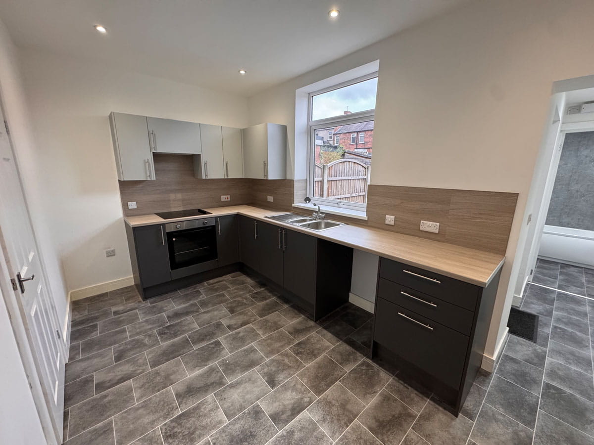 With an attractive range of wall and base units, working surfaces incorporating a sink, drainer, integrated electric oven, hob and extractor, a rear facing uPVC double glazed window and door leading to the rear yard.